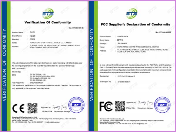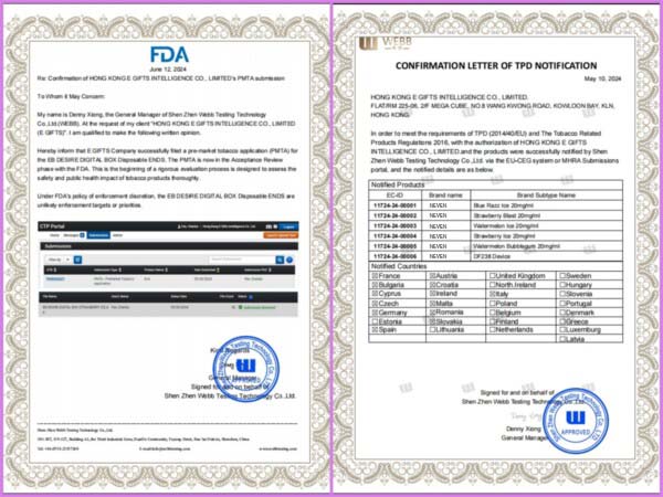 Product Certificates of FDA (PMTA), TPD (EU-CEG), CE, FCC, ROHS etc